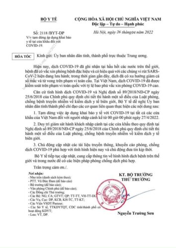 Trong văn bản hỏa tốc gửi Ủy ban nhân dân các tỉnh, thành phố, Bộ Y tế nêu rõ: Tạm dừng việc áp dụng khai báo y tế với COVID-19 tại tất cả các cửa khẩu của Việt Nam đối với người nhập cảnh kể từ 00 giờ 00 phút ngày 27/4/2022.